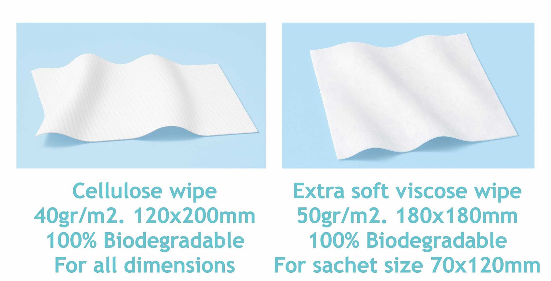 An extra soft and strong viscose wipe of 50g/m². Size approximately 180x180 mm. This is a more luxurious, thicker, and softer-feeling wipe with more liquid capacity and greater absorbency, and is also 100% biodegradable. This luxurious, thicker wipe only fits in the larger sachets of 70x120 mm.
